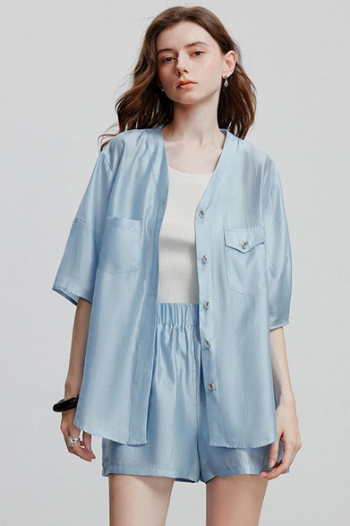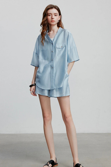 The Zariys Eirene Set is your go-to ensemble for effortless sophistication. Designed in a soft, airy light blue fabric, this two-piece outfit features an oversized button-up shirt with short sleeves and a classic collar, paired with matching high-waisted shorts for a polished yet relaxed look. Perfect for spring and summer days, this co-ord brings versatility and comfort to your modern wardrobe.